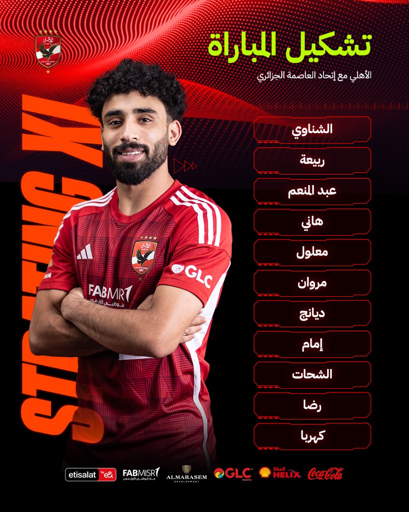 دخل السويسري مارسيل كولى مدرب الأهلي، مباراة فريقه أمام اتحاد العاصمة الجزائري بتشيكل مكون من: -