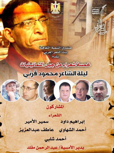 يقيم صندوق التنمية الثقافية برئاسة الدكتوروليد قانوش، من خلال بيت الشعر العربي ندوة تحت عنوان خمسة شعراء من جيل الثمانينات.. ليلة الشاعر محمود قرني.
