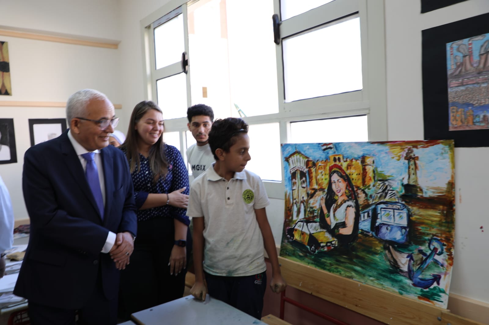 وقد تفقد الوزير والمحافظ قاعات رياض الأطفال وعددا من فصول المدرسة، وقاعة التربية الفنية واستعرضا أيضا أعمال الطلاب الفنية خلال حضورهم مركز تنمية القدرات الصيفي، وأشاد الوزير بأعمال الطلاب من رسومات، ولوحات، والرسم على المعادن، وحث الوزير الطلاب على الاستمرار في ممارسة هوايتهم وتنمية مهاراتهم الفنية.