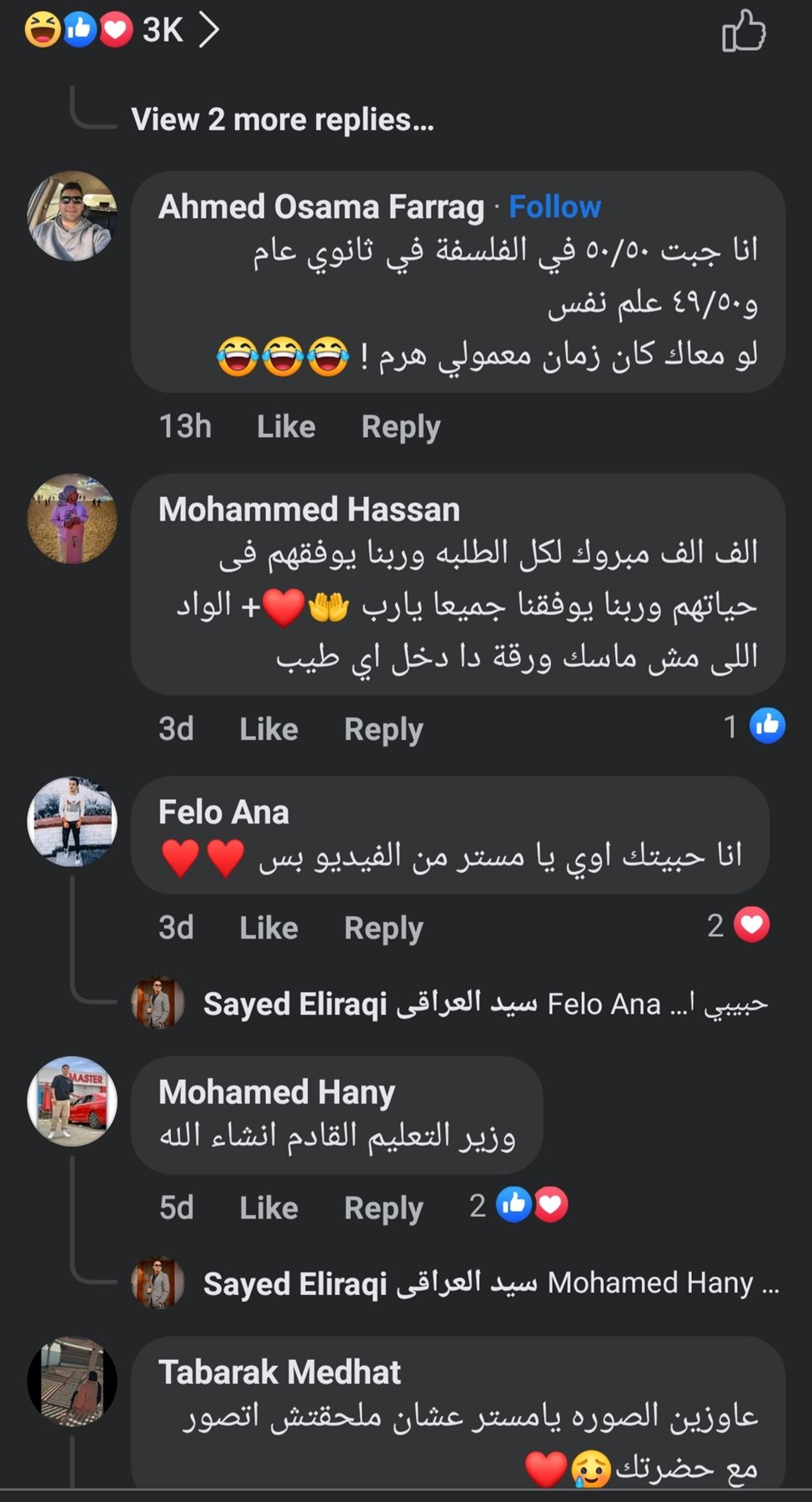 وقالت إحدى متابعي مواقع التواصل الاجتماعي تعقيبًا على الفيديو: أستاذي العظيم، كنت طالبة حضرت دفعة 2018ـ بفتخر أني في يوم كنت طالبة وابنة لحضرتك.. دايما أستاذي وأستاذ مصر كلها.