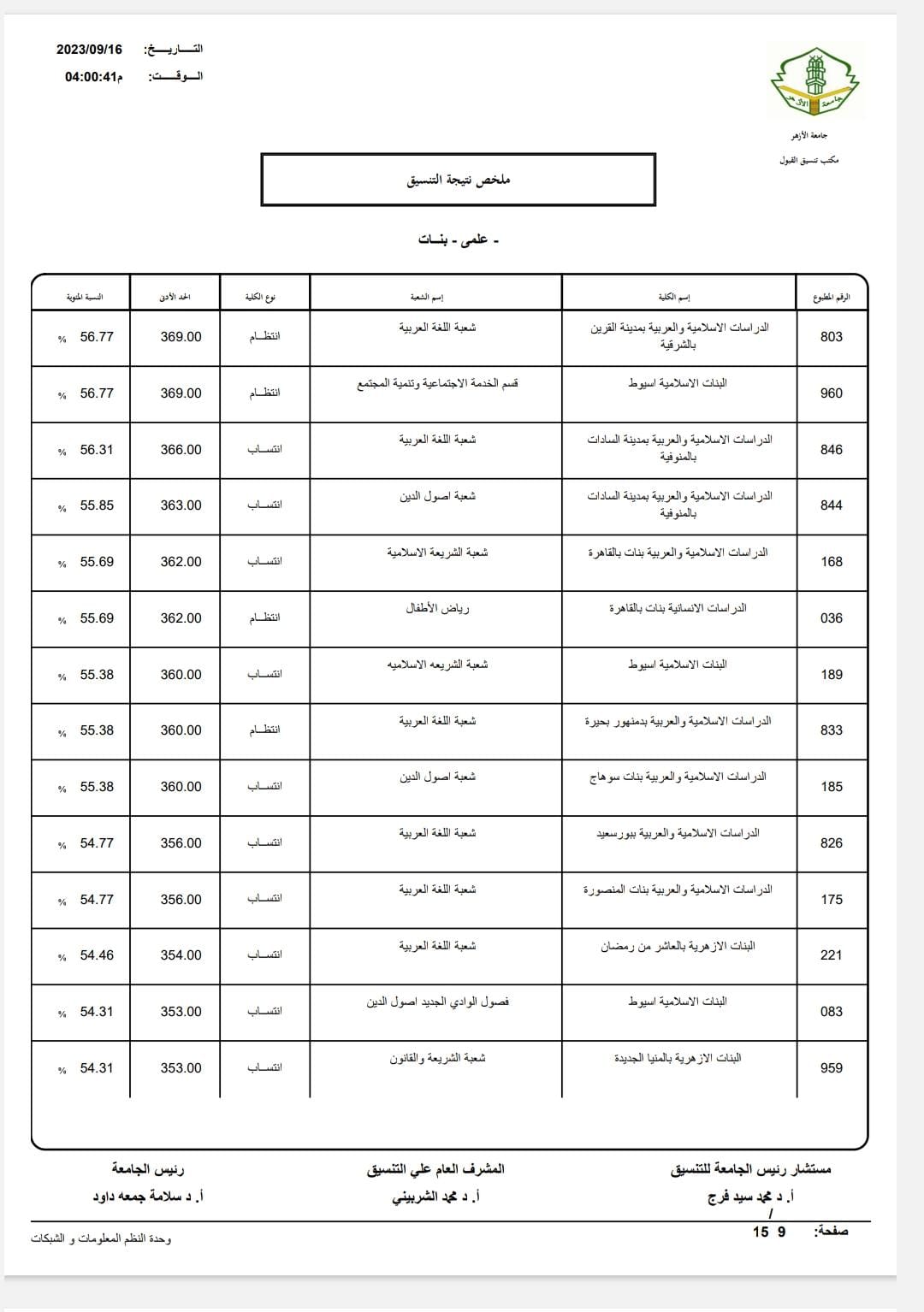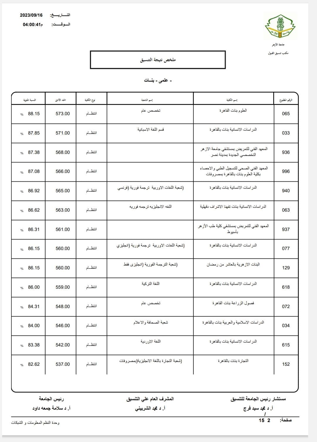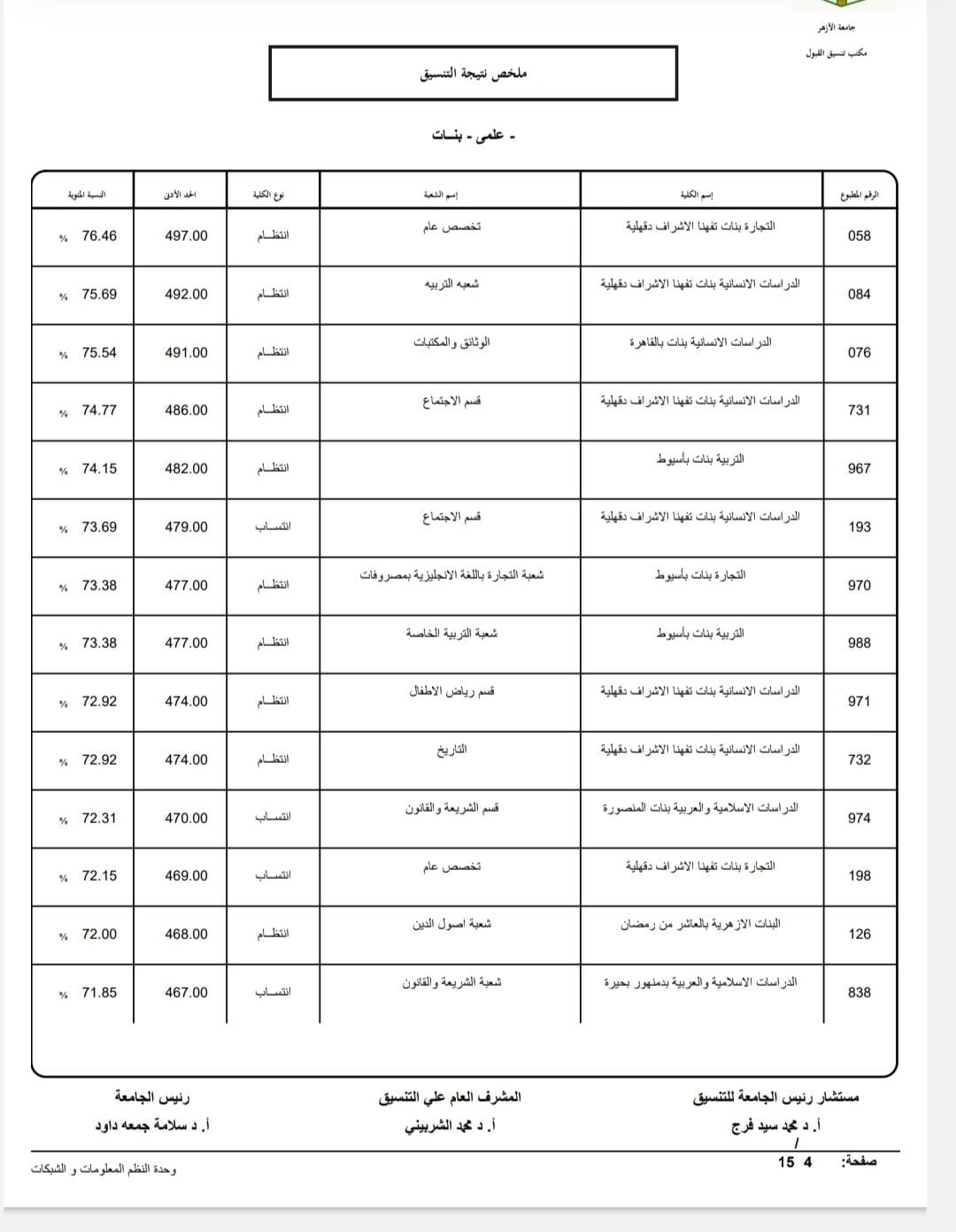 وكان قد أعلن فضيلة الدكتور سلامه داود رئيس جامعة الأزهر النسبة المئوية للحد الأدنى للقبول بالكليات حيث جاءت كالتالي: