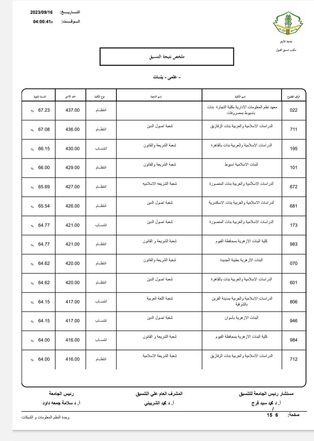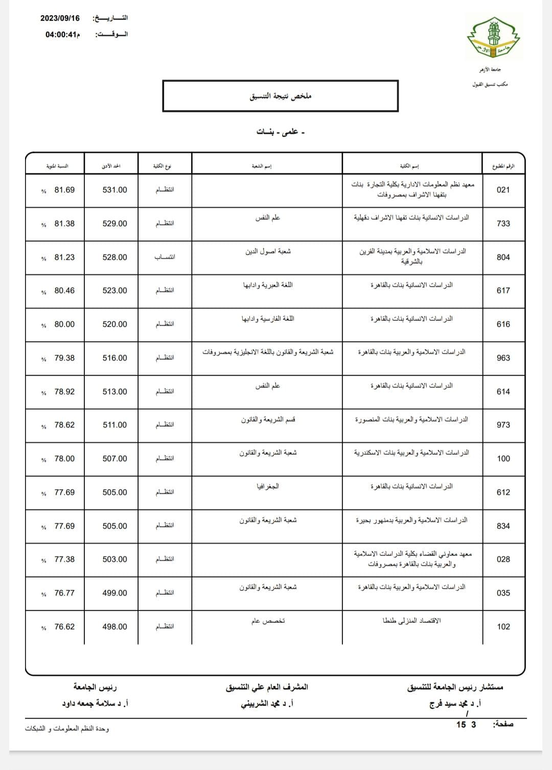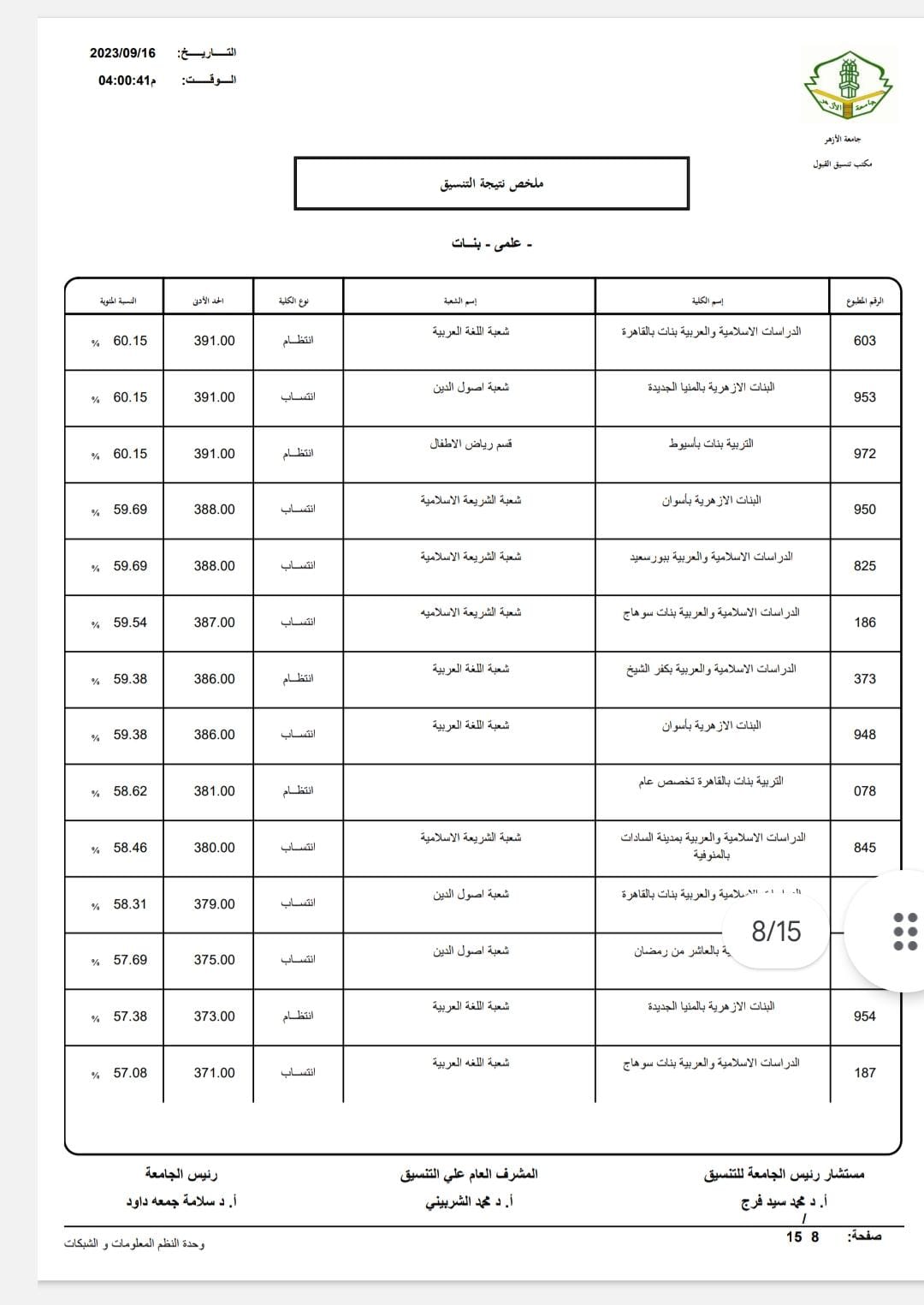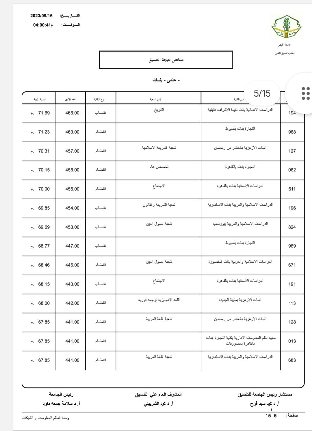 وكان قد أعلن فضيلة الدكتور سلامه داود رئيس جامعة الأزهر النسبة المئوية للحد الأدنى للقبول بالكليات حيث جاءت كالتالي: