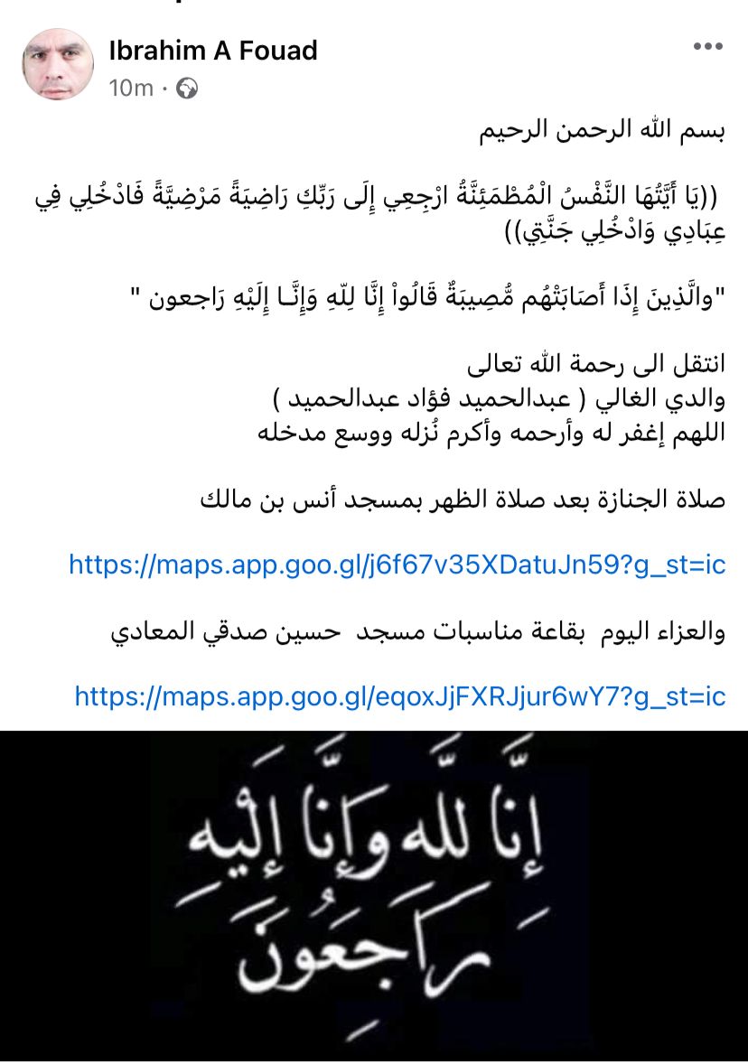 أعلن إبراهيم فؤاد شقيق الفنان محمد فؤاد عن موعد الجنازة والعزاء لشقيقهما المتوفى، وكتب على صفحته على فيسبوك: ( بسم الله الرحمن الرحيم