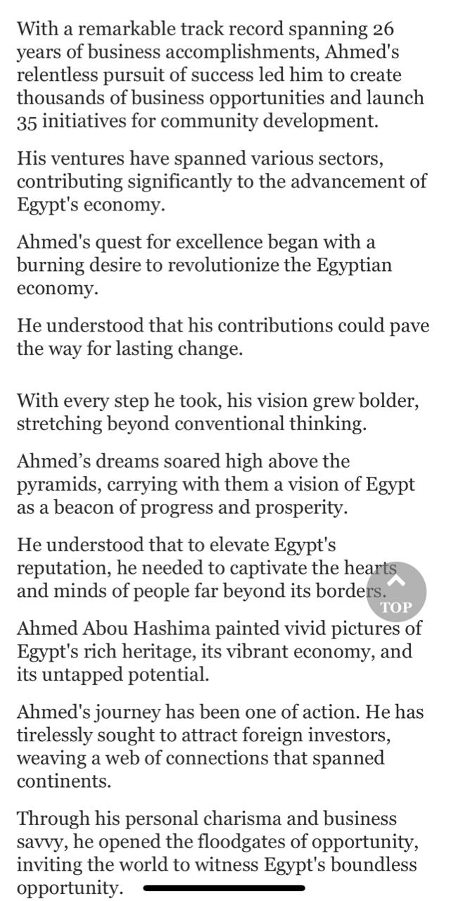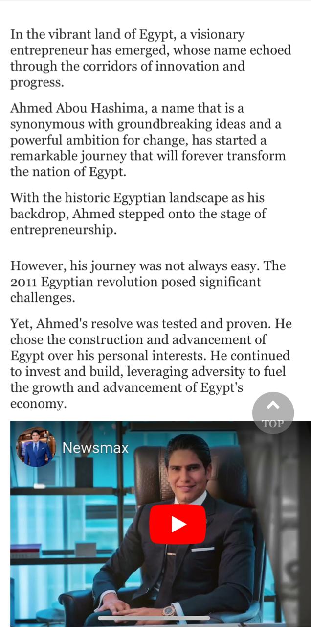 وأشار تقرير نيوز ماكس، إلى جهود أبو هشيمة، في الترويج لإمكانيات مصر اللا محدودة، والتي جعلت طموحه أيضًا لا محدود.