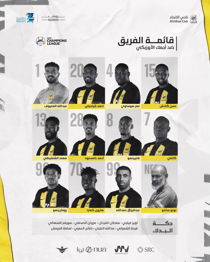 أعلن البرتغالي نونو سانتو مدرب فريق اتحاد جدة السعودي، تشكيل فريقه الرسمي لمواجهة نظيره أجمك الأوزبكي، ضمن منافسات بطولة دوري أبطال آسيا.