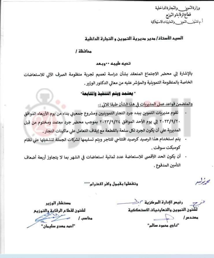 وذكر الخطاب أن محضر الاجتماع المنعقد بشأن دراسة تعميم تجربة منظومة الصرف الآلي للاستعاضات الخاصة بالمنظومة التموينية والمؤشر عليه من وزير التموين، ببدء جرد التجار التموينيين ومشروع جمعيتي بداء من يوم الأربعاء الموافق 20/9/2023، إلى يوم الأحد الموافق 24/9/2023، بموجب محضر جرد معتمد ومختوم من قبل المديرية على أن يكون الجرد لكل سلعة بالقطعة مع إيقاف التعامل على ماكينات التجار.