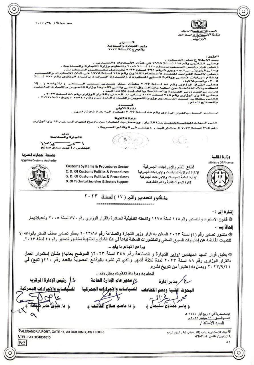 وكان آخر قرار أصدره وزير التجارة والصناعة بحظر تصدير السكر خلال شهر يونيو الماضي، كما سبقة قرار في شهر مارس مارس من العام ذاته.
