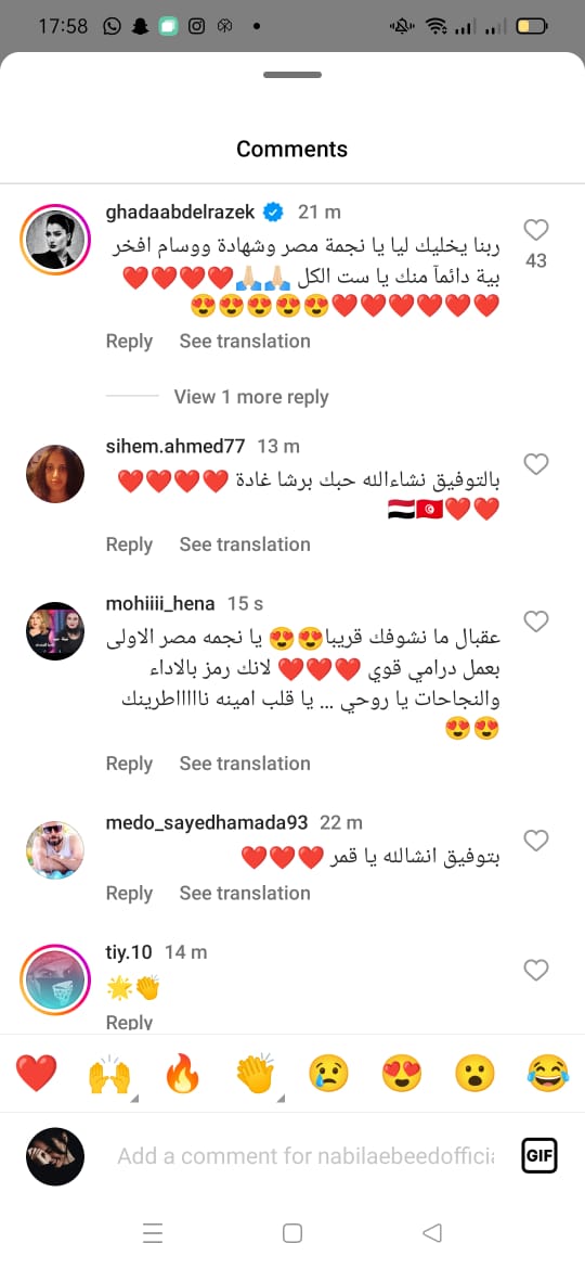 وردت غادة عبد الرازق على إشادة الفنانة نبيلة عبيد بها، حيث علقت على منشورها قائلة: ربنا يخليكي ليا يا نجمة مصر، وشهادة ووسام أفخر به دائمًا منك يا ست الكل.