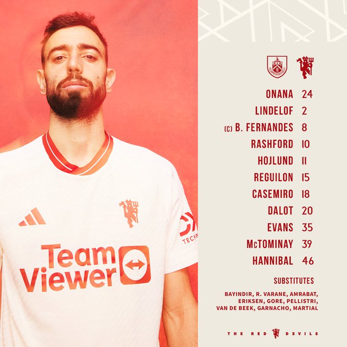 أعلن إريك تين هاج، المدير الفني لفريق مانشستر يونايتد، التشكيل الأساسي لفريقه لمواجهة فريق بيرنلي، خلال اللقاء الذي سيجمع بين الفريقين على ملعب تيرف مور، ضمن منافسات الجولة السادسة من عمر مسابقة الدوري الإنجليزي الممتاز.