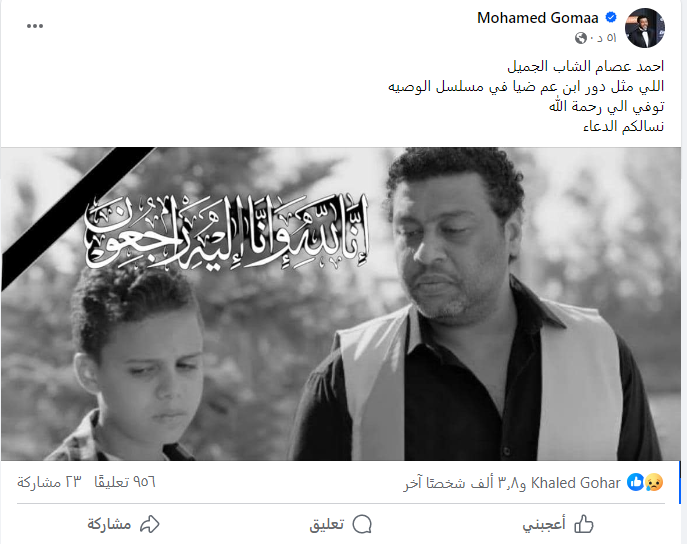 وكتب الفنان محمد جمعة، على حسابه الشخصي بموقع فيس بوك، منشورا ينعى فيه الراحل الشاب أحمد عصام، إذ قال: أحمد عصام الشاب الجميل، اللي مثل دور ابن عم ضيا في مسلسل الوصية، توفي إلى رحمة الله.. نسألكم الدعاء.