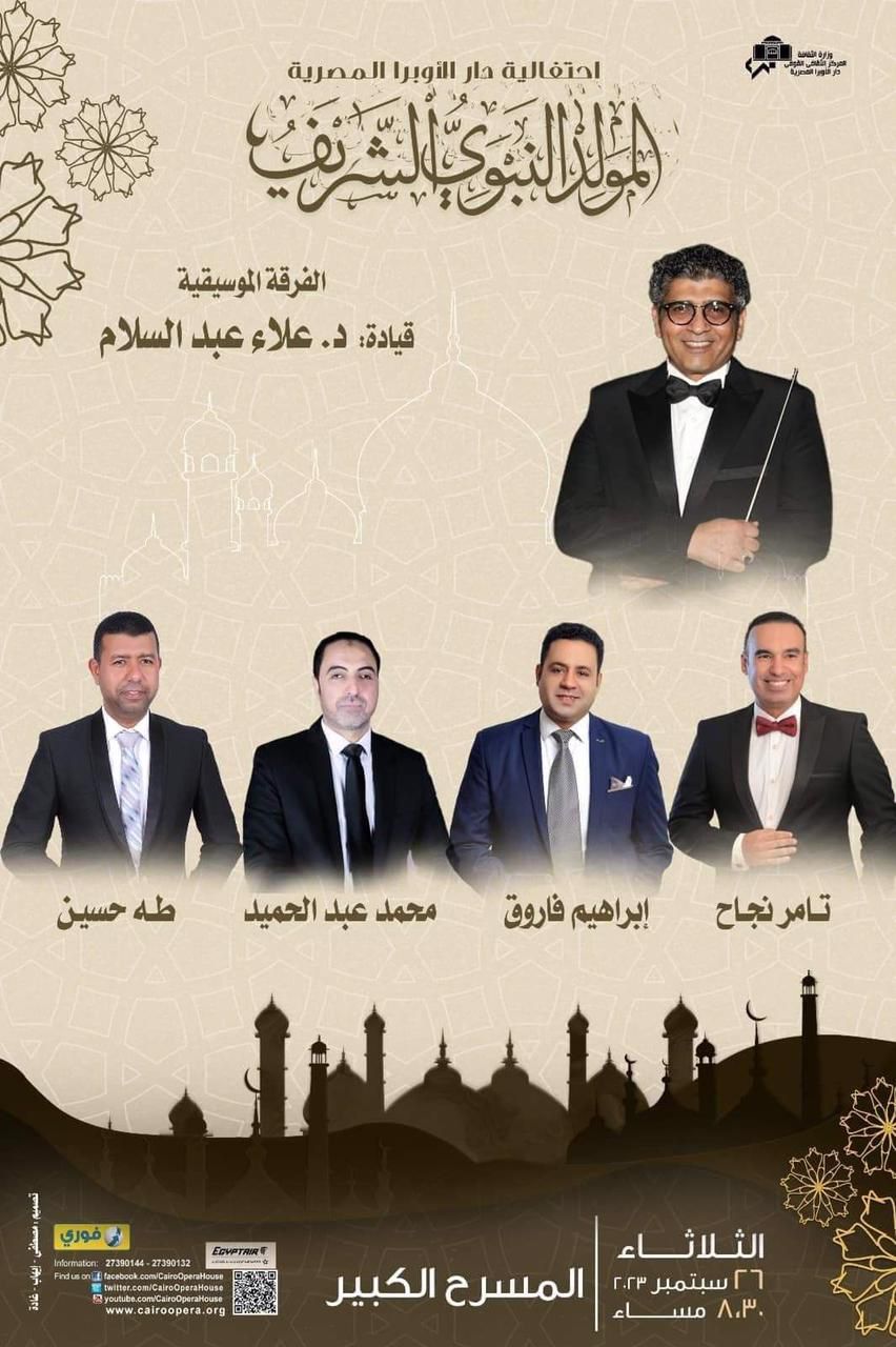 تنظم دار الأوبرا المصرية برئاسة الدكتور خالد داغر احتفالية فنية تقام بقيادة المايسترو الدكتور علاء عبد السلام، ومشاركة الفنانة مروة ناجي مع نجوم الإنشاد الديني بالأوبرا، بمناسبة ذكرى المولد النبوي الشريف.