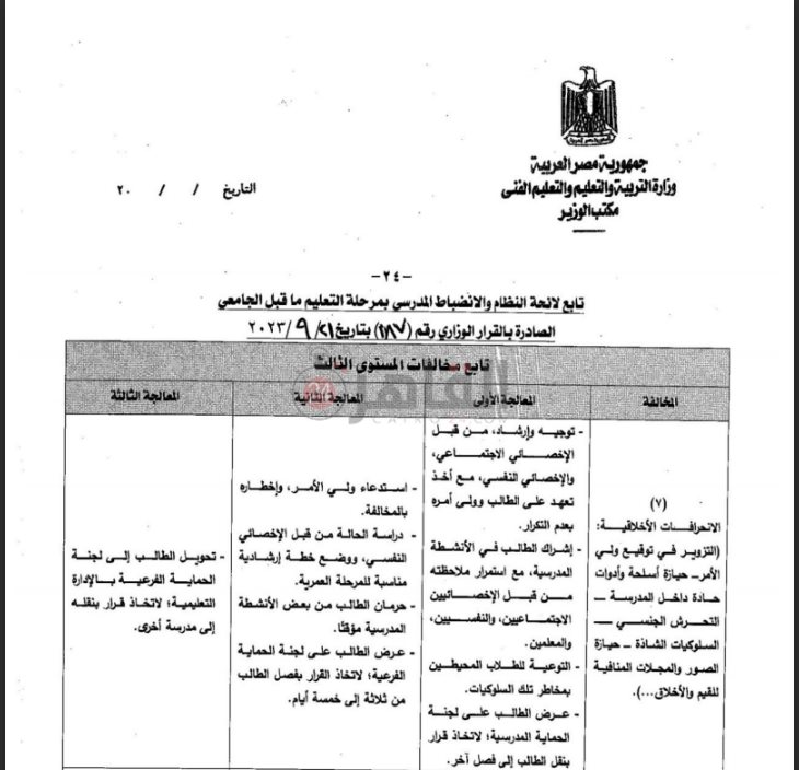 وأوضحت الوزارة، أنه في المعالجة الثانية يتم استدعاء ولي الأمر، وإخطاره بالمخالفة، ودراسة الحالة من قبل الإخصائي النفسي، ووضع خطة إرشادية مناسبة للمرحلة العمرية، وكذلك حرمان الطالب من بعض الأنشطة المدرسية مؤقتا، وعرض الطالب على لجنة الحماية الفرعية لاتخاذ القرار بفصل الطالب من ثلاثة إلى خمسة أيام.