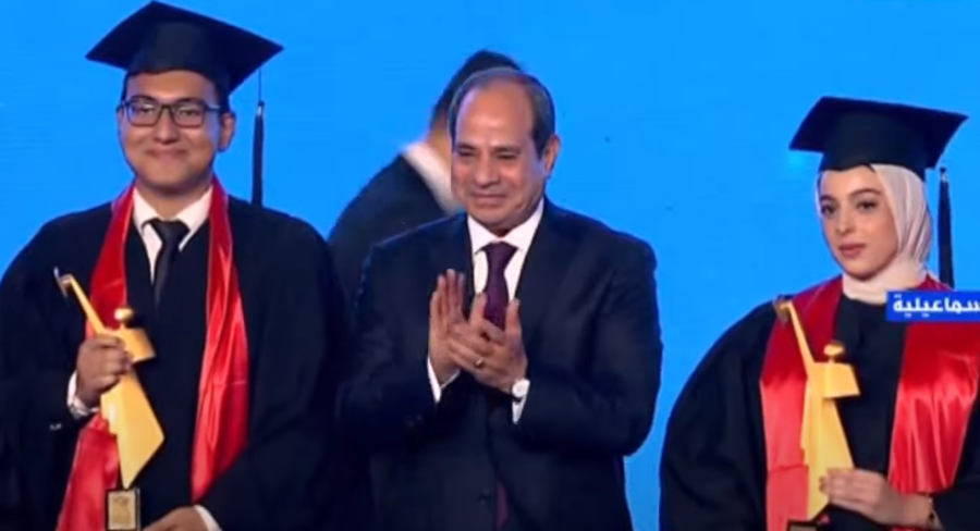 الرئيس السيسي يتوسط صورة تذكارية مع أوائل الخريجين في يوم تفوق جامعات مصر