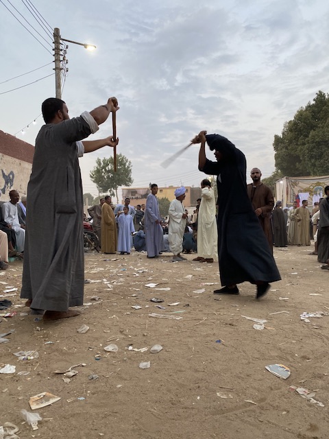 وانطلق الشباب من على ظهور الجمال والخيول يتراقصون على أنغام المزمار والطبلة البلدي وهي تعزف النغمات والأغاني الصعيدية الشعبية الشهيرة.