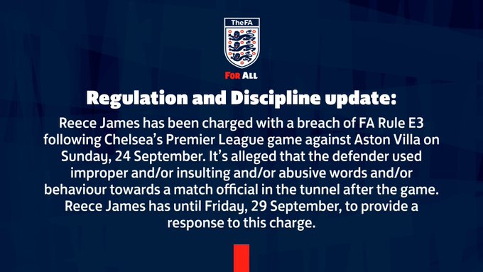 وأكد الاتحاد الإنجليزي لكرة القدم في بيانه، أنه تم اتهام ريس جيمس بانتهاك قاعدة الاتحاد الإنجليزي E3 بعد مباراة تشيلسي في البريميرليج ضد أستون فيلا يوم الأحد، 24 سبتمبر، يُزعم أن المدافع استخدم كلمات وسلوكًا غير لائق ومهينًا ومسيئًا تجاه حكم المباراة في النفق بعد المباراة.