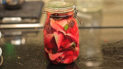 - حضري المحلول الملحي بإذابة كوبين ملح على 4 لترات من الماء وضعي الفلفل الحار وعصير الليمون.