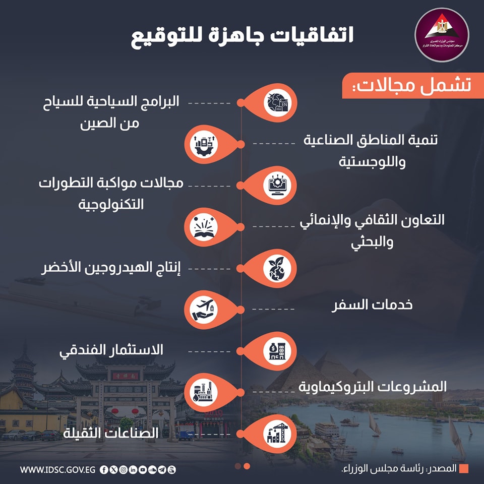 مركز معلومات الوزراء: تعاون مصر والصين يشهد تقدما ملحوظا.. واتفاقيات جاهزة للتوقيع بـ9 مجالات