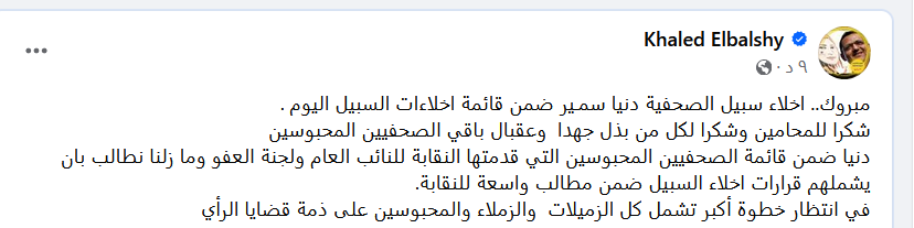 وكتب البلشى خلال منشور له عبر صفحته الرسمية على موقع التواصل الاجتماعي فيس بوك: شكرا للمحامين وشكرا لكل من بذل جهدا وعقبال باقي الصحفيين المحبوسين، وما زلنا نطالب بأن يشملهم قرارات إخلاء السبيل ضمن مطالب واسعة للنقابة.