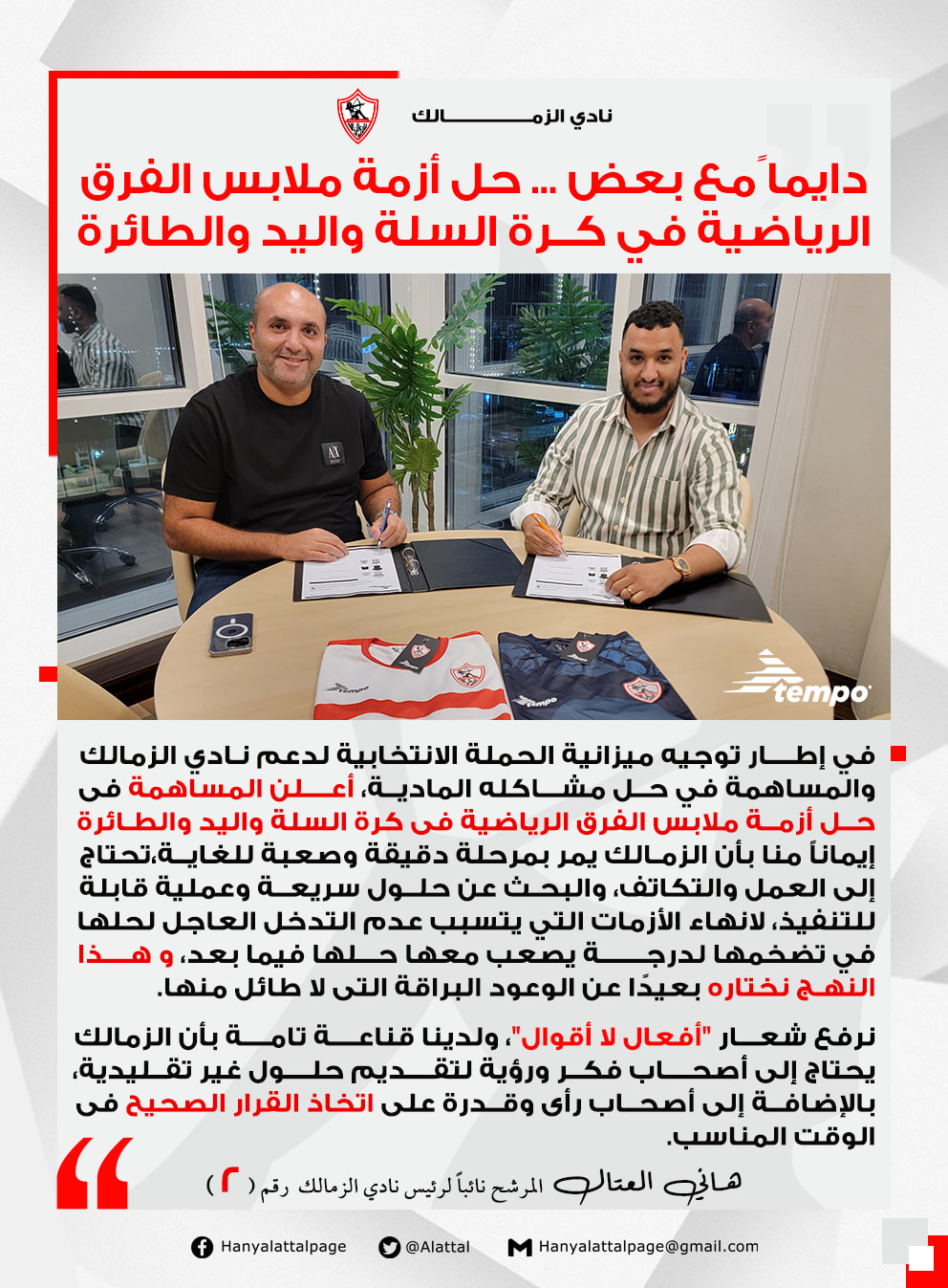 في إطار توجيه ميزانية الحملة الانتخابية لدعم نادي الزمالك والمساهمة في حل مشاكله المادية، أعلن المساهمة في حل أزمة ملابس الفرق الرياضية في كرة السلة واليد والطائرة، إيمانًا منا بأن الزمالك يمر بمرحلة دقيقة وصعبة للغاية، تحتاج إلى العمل والتكاتف والبحث عن حلول سريعة وعملية قابلة للتنفيذ، لإنهاء الأزمات التي يتسبب عدم التدخل العاجل لحلها في تضخمها لدرجة يصعب معها حلها فيما بعد، وهذا النهج نختاره بعيدًا عن الوعود البراقة التي لا طائل منها”.