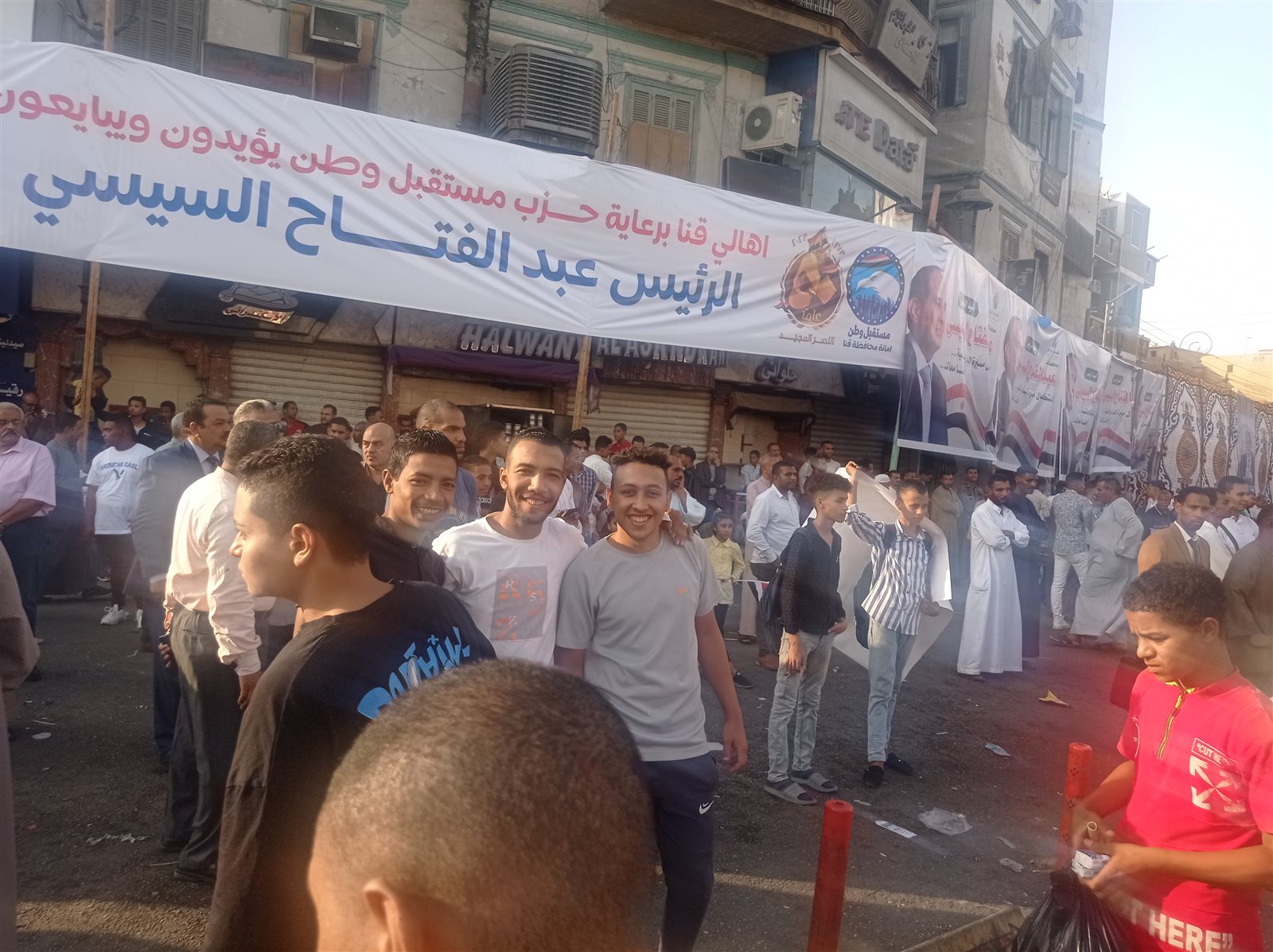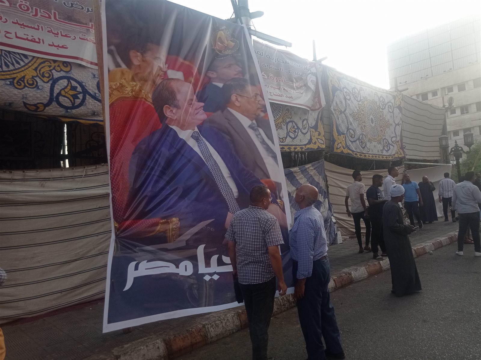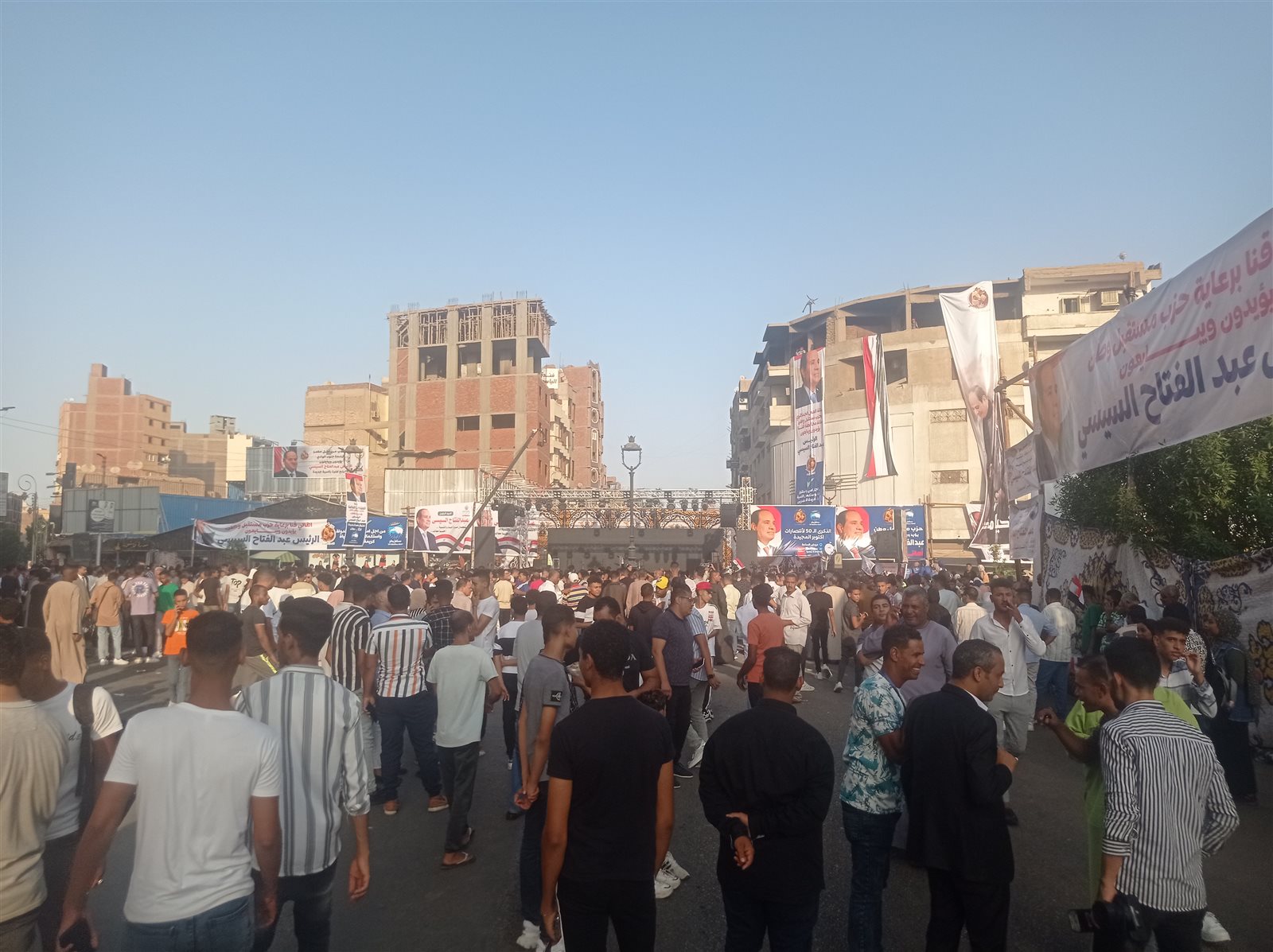 ورفع عدد كبير من الحاضرين لافتات عليها صور الرئيس عبد الفتاح السيسي لدعمه في الانتخابات الرئاسية المقبلة، كما زين الأهالي الميدان بلافتات كبيرة ضخمة بها عبارات تأييد للرئيس.