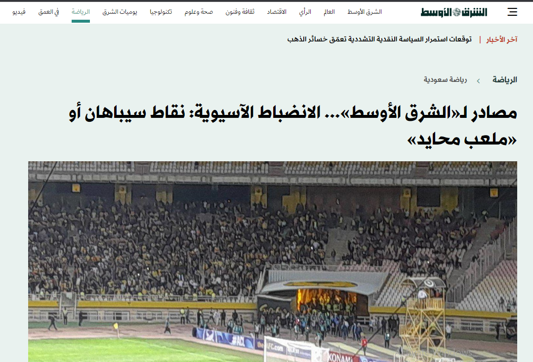 عنونت صحيفة الشرق الأوسط السعودية بـ مصادر من لجنة الانضباط الآسيوية: نقاط سيباهان أو «ملعب محايد».