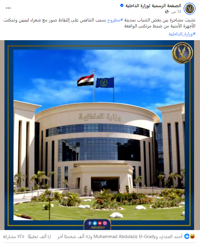 لم تستغرق وزارة الداخلية أكثر من ساعة للرد على الأخبار الكاذبة المروجة عن أحداث مطروح، إذ أصدرت بيانًا رسميًا عبر صفحتها الشخصية بموقع التواصل الاجتماعي فيس بوك، جاء فيه: نشبت مشاجرة بين بعض الشباب بمدينة مطروح بسبب التنافس على التقاط صور مع شعراء ليبيين وتمكنت الأجهزة الأمنية من ضبط مرتكبي الواقعة.