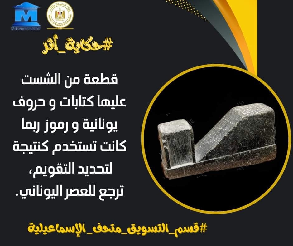 أعلنت إدارة متحف آثار الإسماعيلية، في بيان لها عن عرض قطعة أثرية فريدة من الشست عليها كتابات وحروف يونانية ورموز ربما كانت تستخدم كنتيجة لتحديد التقويم، ترجع للعصر اليوناني.