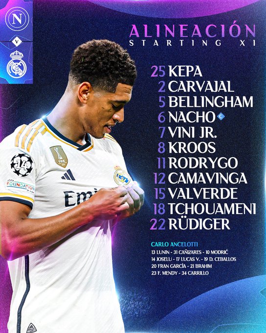 فينسيوس وبيلنجهام يقودان تشكيل ريال مدريد ضد نابولي في دوري أبطال أوروبا