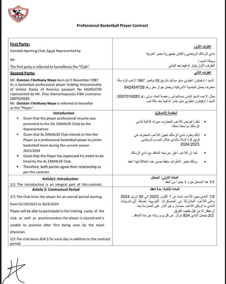 الزمالك ينجح في تجديد تعاقد أوجي مايو محترف فريق السلة | مستند