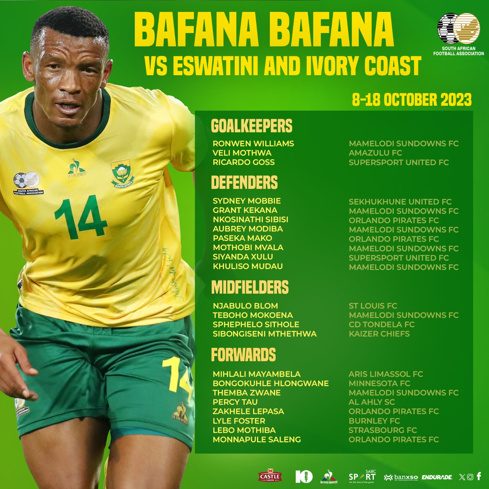 أعلن هوجو بروس المدير الفني لمنتخب جنوب إفريقيا قائمته لخوض فترة التوقف الدولي المقبلة، المقرر إقامتها في شهر أكتوبر الجاري.