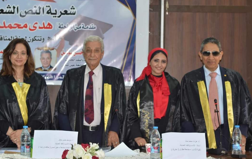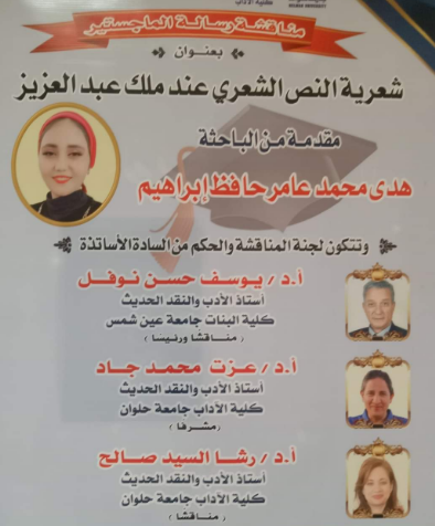 حصلت الباحث هدى محمد عامر حافظ على درجة الماجستير في النقد الأدبي في البحث المقدم منها إلى قسم اللغة العربية بكلية الآداب جامعة حلوان، حيث تم منحها الدرجة بتقدير ممتاز مع التوصية بالطبع.