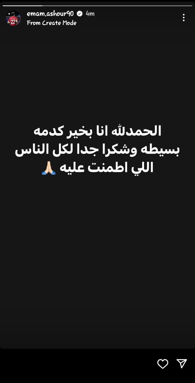 تفاصيل إصابة إمام عاشور كشف عنها اللاعب عبر ستوري عبر صفحته الشخصية على موقع انستجرام حيث نشر إمام عاشور عبر ستوري إنستجرام: الحمد لله أنا بخير، كدمة بسيطة، وشكرًا لكل الناس اللي اطمنت عليا.