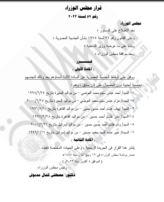 قرار رئيس الوزراء بشأن إسقاط الجنسية عن 6 أشخاص تضمن الآتي: إسقاط الجنسية المصرية عن السادة الآتية أسماؤهم، وذلك لتجنسهم بجنسية أجنبية دون الحصول على إذن سابق، وهم:-