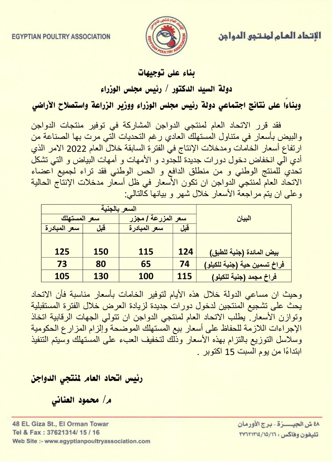وحث الاتحاد على تشجيع المنتجين لدخول دورات جديدة لزيادة العرض خلال الفترة المستقبلية وتوازن الأسعار، يطلب الاتحاد العام لمنتجي الدواجن ان تتولي الجهات الرقابية اتخاذ الإجراءات اللازمة للحفاظ على أسعار بيع المستهلك الموضحة وإلزام المزارع الحكومية وسلاسل التوزيع بالتزام بهذه الأسعار وذلك لتخفيف العبء على المستهلك وسيتم التنفيذ ابتداء من يوم 15 أكتوبر.