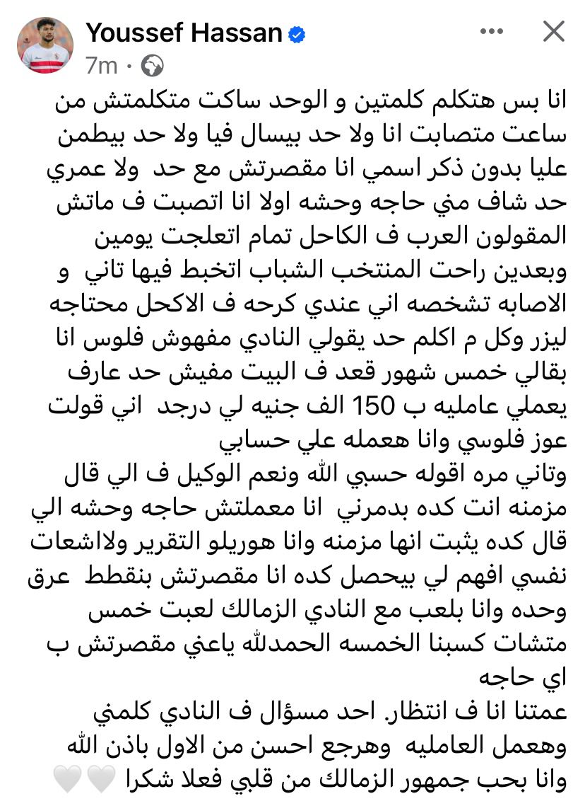 ونشر يوسف حسن بيانًا رسيمًا عبر حسابه الرسمي على موقع التواصل الاجتماعي فيسبوك قال فيه: أنا بس هتكلم كلمتين والواحد ساكت متكلمش من ساعة ما تصابت أنا ولا حد بيسأل فيا ولا حد بيطمن عليا، بدون ذكر أسامي أن مقصرتش مع حد ولا عمري حد شاف مني حاجة وحشة.