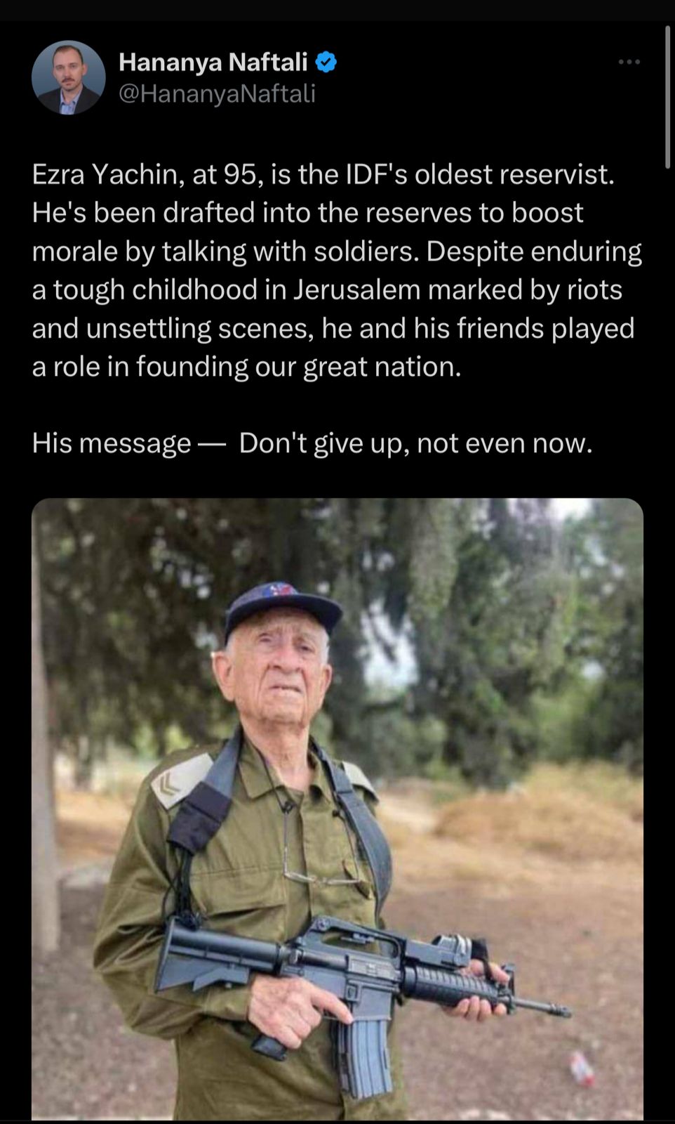 «رسالته - لا تستسلم، ولا حتى الآن»، بتلك الكلمات احتفى ناشط إسرائيلي المدعو «حنانيا نفتالي»، بخبر استدعاء العجوز صاحب التسعيني لرفع روح معنويات قوات الاحتلال، في تغريدة له بموقع «اكس» تويتر سابقًا، قائلًا: «عزرا ياكين، البالغ من العمر 95 عامًا، هو أقدم جندي احتياط في الجيش الإسرائيلي، لقد تم تجنيده في الاحتياط لرفع الروح المعنوية من خلال التحدث مع الجنود، وعلى الرغم من طفولة صعبة في القدس تميزت بأعمال شغب ومشاهد مقلقة، فقد لعب هو وأصدقاؤه دورًا في تأسيس أمتنا العظيمة».