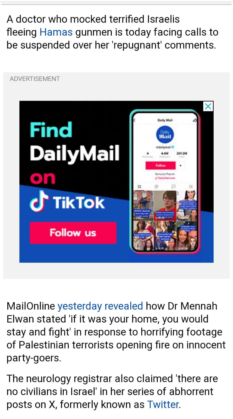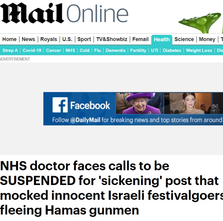 نشرت طبيبة مصرية، تدعى منة علوان، والتي تعمل طبيبة في بريطانيا، تغريدة عبر صفحتها الشخصية، بموقع التغريدات القصيرة إكس تويتر سابقًا، حيث دعمت المقاومة الفلسطينية وهاجمت إسرائيل، خلال التصعيد الأخير بينهما، مما عرضها لهجوم واسع النطاق من قبل الإعلام، وتحديدًا صحيفة ديلي ميل البريطانية، مطالبة بوقفها عن العمل وتحويلها للتحقيق.