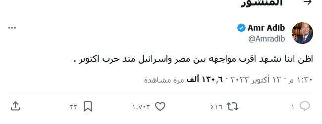 وفي تدوينة له عبر منصة X تناول عمر أديب مستجدات وتبعات العدوان الإسرائيلي، قائلا: أظن أننا نشهد أقرب مواجهة بين مصر وإسرائيل منذ حرب أكتوبر.