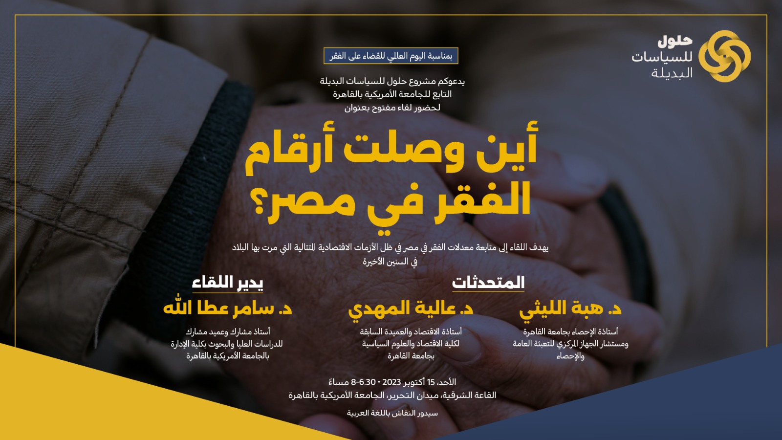 ينظم مشروع حلول للسياسات البديلة ندوة بمناسبة اليوم العالمي للقضاء على الفقر بعنوان: أين وصلت أرقام الفقر في مصر؟ وذلك غدا الأحد 15 أكتوبر الجاري بالقاعة الشرقية بمقر الجامعة الأمريكية بالتحرير.