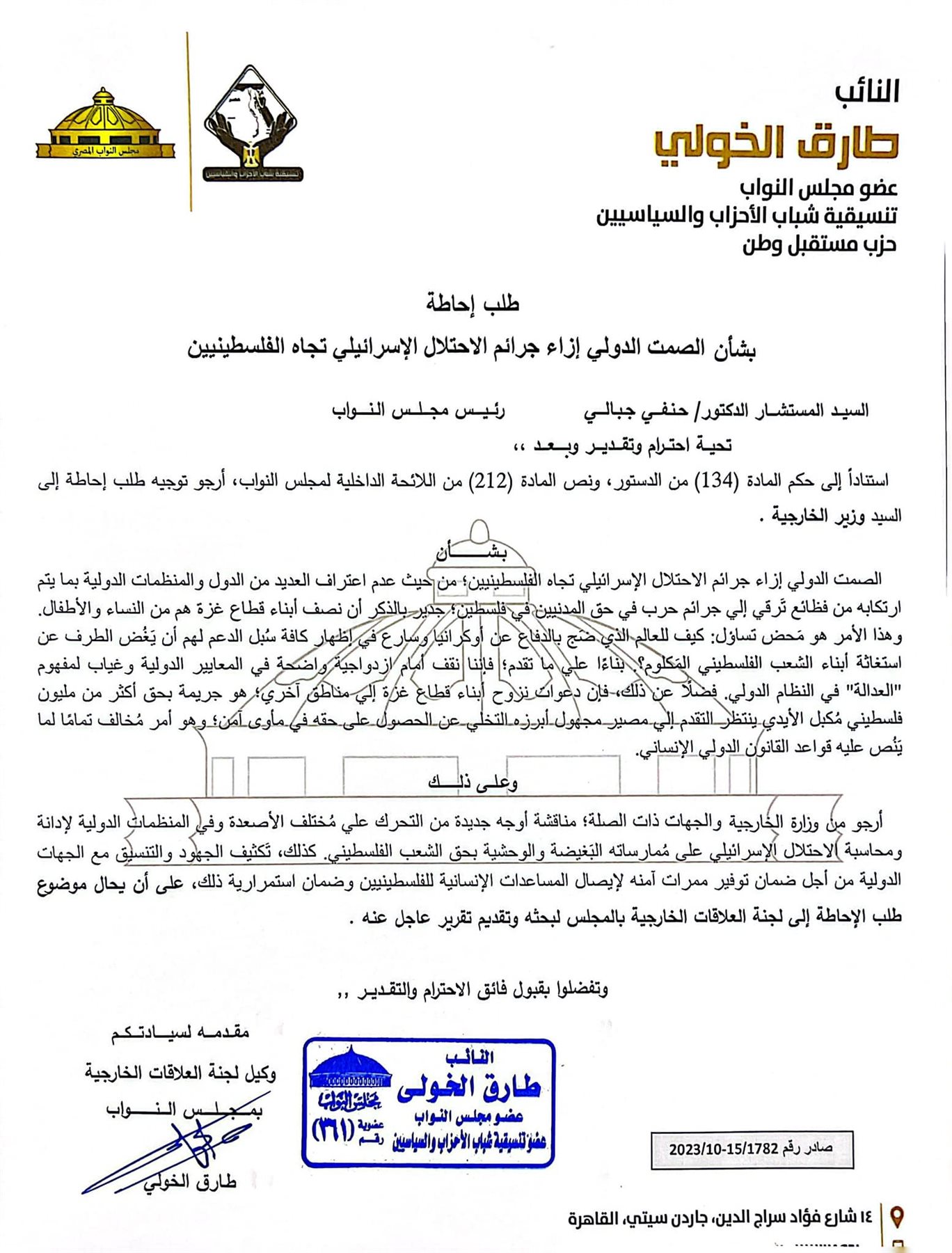 تقدم النائب طارق الخولي وكيل لجنة العلاقات الخارجية بمجلس النواب بطلب إحاطة إلى المستشار حنفي جبالي، موجه إلى وزير الخارجية، بشأن الصمت الدولي إزاء جرائم الاحتلال الإسرائيلي تجاه الفلسطينيين.