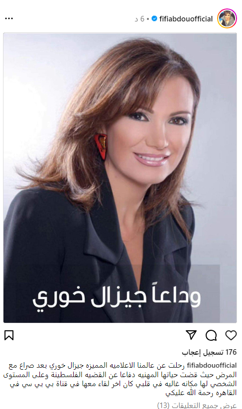 ونعت الفنانة فيفي عبده الراحلة جيزال خوري بكلمات مؤثرة عبر حسابها الشخصي بموقع تبادل الصور والفيديوهات القصيرة انستجرام، قائلة: رحلت عن عالمنا الإعلامية المميزة جيزال خوري، بعد صراع مع المرض، حيث قضت حياتها المهنية دفاعا عن القضية الفلسطينية، وعلى المستوى الشخصي لها مكانة غالية في قلبي.. كان آخر لقاء معها في قناة بي بي سي في القاهرة، رحمة الله عليكي.
