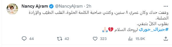 بينما روت الفنانة نانسي عجرم موقفًا جمعها بـ الإعلامية جيزال خوري، عبر تغريدة بموقع تويتر، قائلة: وقفت جنبك وكان عمري 8 سنين، وكنتي صاحبة الكلمة الحلوة والقلب الطيب والإرادة الصلبة بقلوب الكل، بتبقي جينزال خوري لـ روحك السلام.