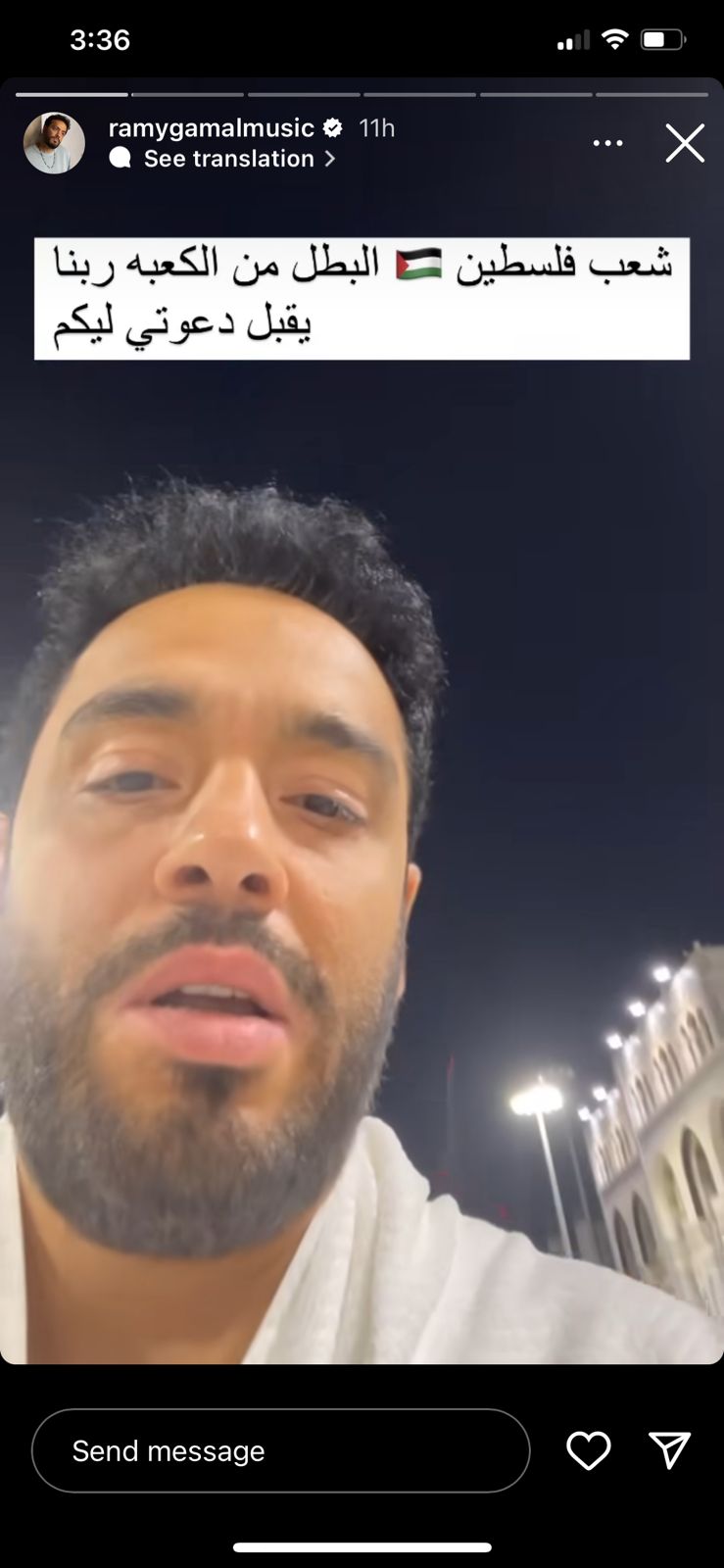 كما نشر رامي جمال ستوري من داخل الحرم المكي وهو يدعي لأهل فلسطين، عبر حسابه الشخصي بانستجرام، حيث قال: شعب فلسطين البطل من الكعبة ربنا يتقبل دعوتي ليكم.