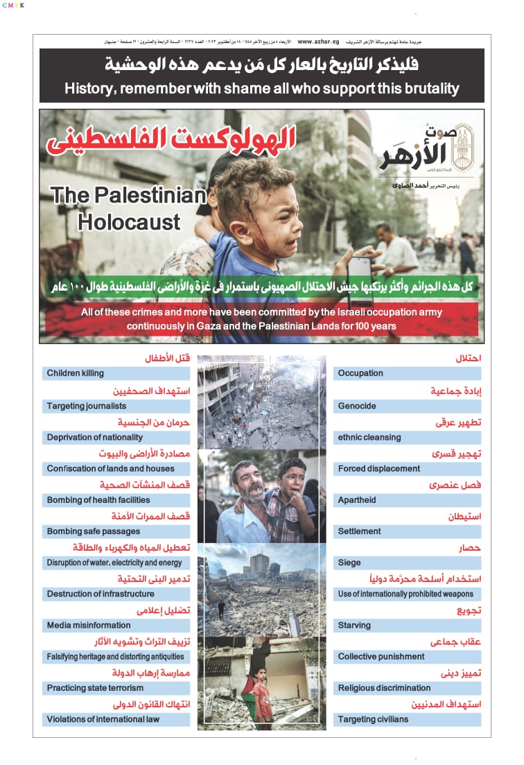 أصدرت مجلة صوت الأزهر عددًا جديدًا من مجلتها حيث يأتي غلافها تحت عنوان “فليذكر التاريخ بالعار كل من يدعم هذه الوحشية”، كما كان ابرز عناوين الغلاف: "الهولوكست الفلسطيني”،