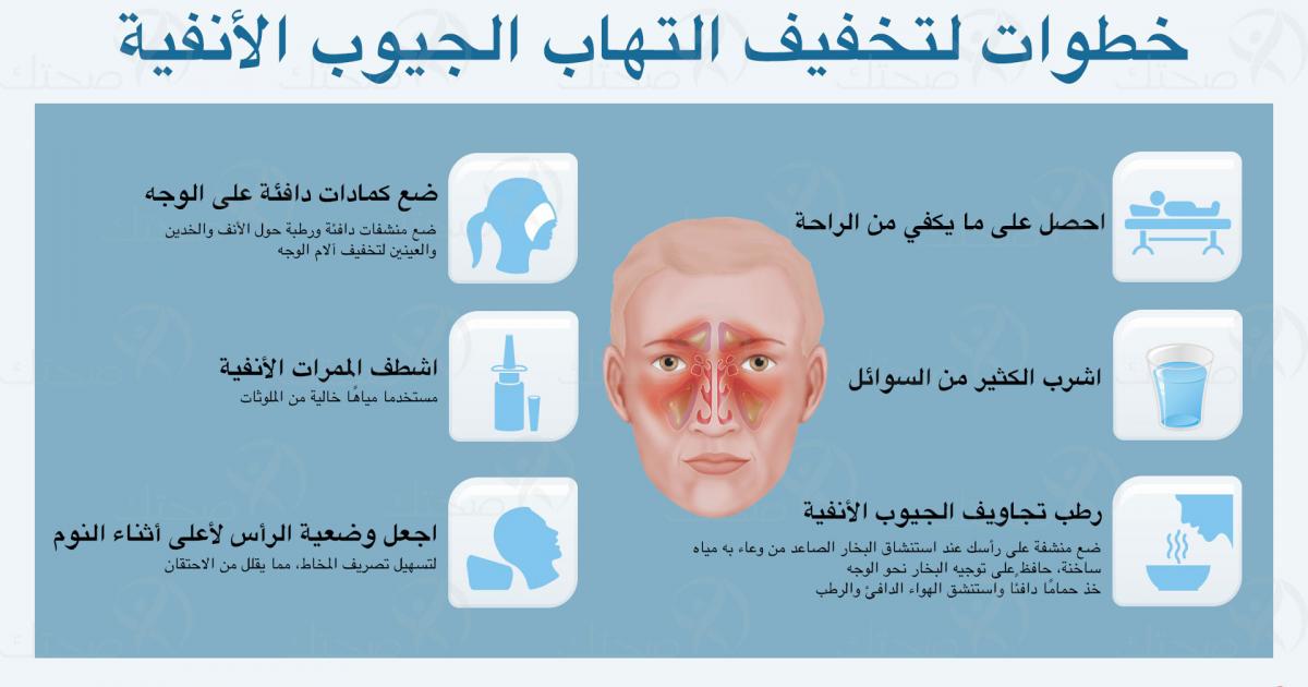 وفي الحالات البسيطة قد تعالج الالتهابات بتنظيف الأنف وتناول مسكن للألم، كذلك الحالات المتوسطة يمكن تناول مضاد للحساسية أو مسكنًا وبعض المشروبات الدافئة والتعرض للبخار، فيما تحتاج الحالات الشديدة والمزمنة لاتباع روتين محدد للحد والتعامل مع التهابات الجيوب الأنفية وعلاجها.