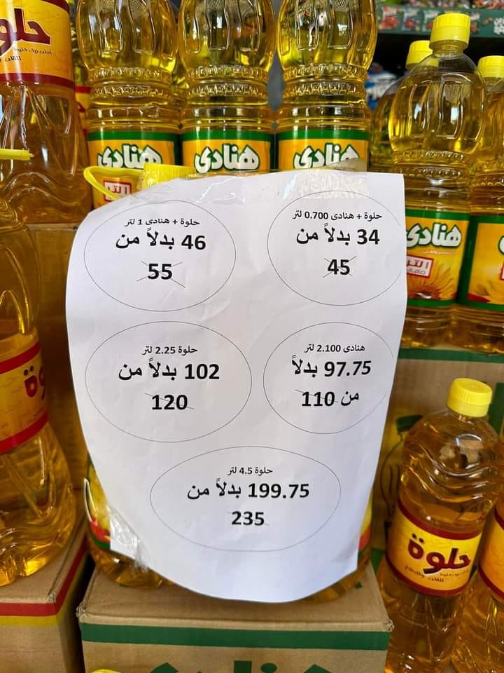 وذكر التجار أنه تم تخفيض أسعار زيت هنادي 2 لتر إلى 98 جنيها بدلا من 110 جنيهات وزيت حلوة 2.25 لتر إلى 102 جنيها بدلا من 120 جنيها في السعر الرسمي.