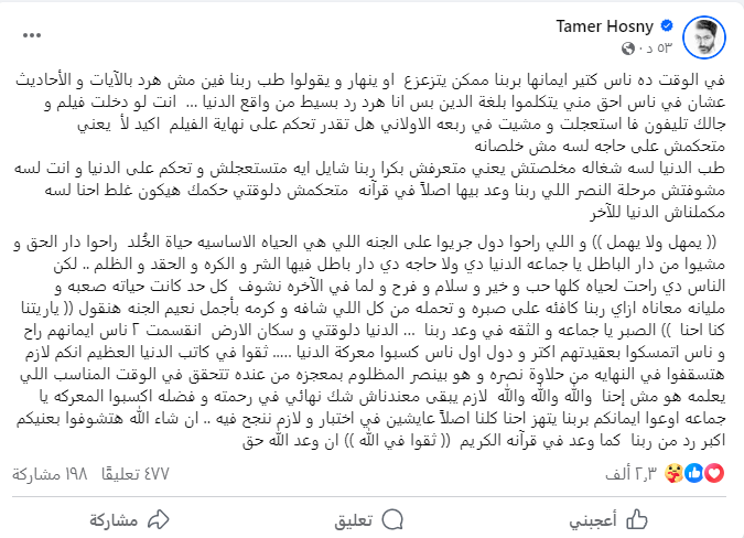 ونشر تامر حسني عبر حسابه الشخصي على موقع الفيس بوك، وكتب: في الوقت ده ناس كتير إيمانها بربنا ممكن يتزعزع أو ينهار ويقولوا طب ربنا فين مش هرد بالآيات والأحاديث عشان في ناس أحق مني يتكلموا بلغة الدين بس أنا هرد رد بسيط من واقع الدنيا، أنت لو دخلت فيلم وجالك تليفون فاستعجلت ومشيت في ربعه الأولاني هل تقدر تحكم على نهاية الفيلم أكيد لأ يعني متحكمش على حاجه لسه مش خلصانة.