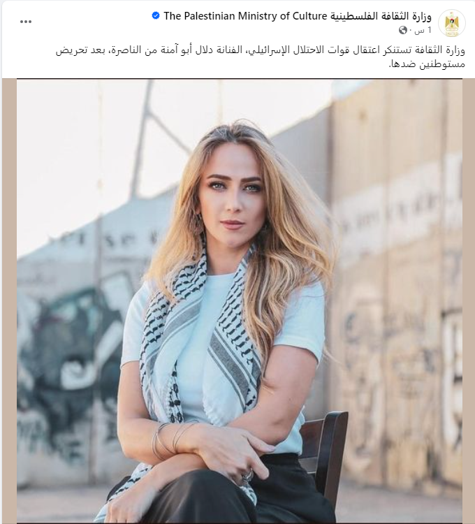 وكتبت وزارة الثقافة الفلسطينية خلال صفحتها الرسمية على فيسبوك، الآتي: وزارة الثقافة تستنكر اعتقال قوات الاحتلال الإسرائيلي الفنانة دلال أبو آمنة من الناصرة، بعد تحريض مستوطنين ضدها.