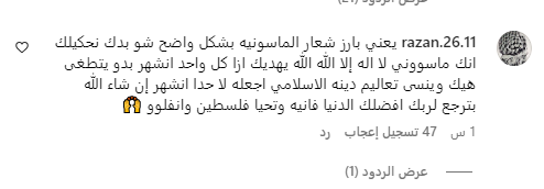 وجاءت التعليقات على النحو التالي: الترويج للماسونية بشكل غبي، أنت إنسان ما بتستحي على حالك.. الغو متابعة من عنده.. أطفال غزة عم تموت يا عيب الشوم عليك.