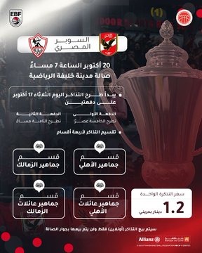 كشف الاتحاد المصري لكرة السلة عن موعد طرح تذاكر المباراة التي ستجمع بين الأهلي والزمالك، في السوبر المصري، والمقرر إقامته يوم 20 أكتوبر الجاري بالبحرين.